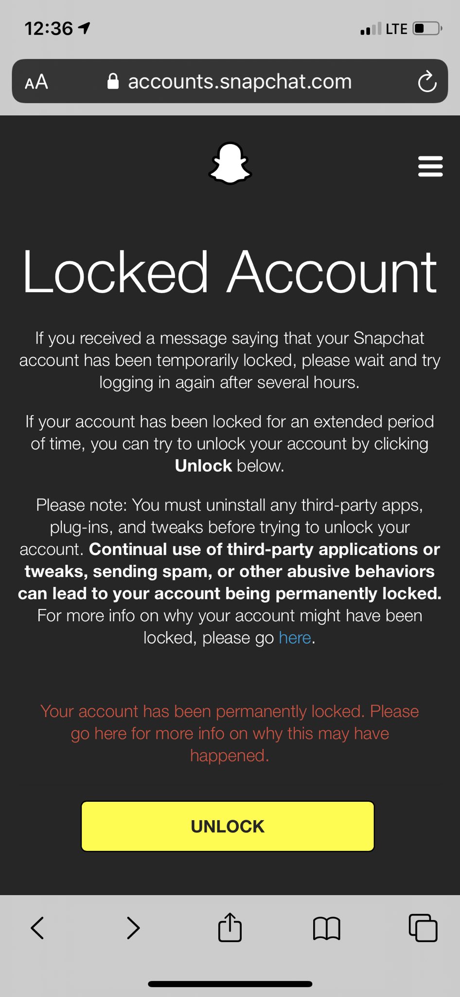 Snapchat Account Permanently Locked I Have So Many Memories And Have Been Using Snapchat For Years Never Used Third Party Apps Or Anything Is There Anyway I Can Get My Account Back